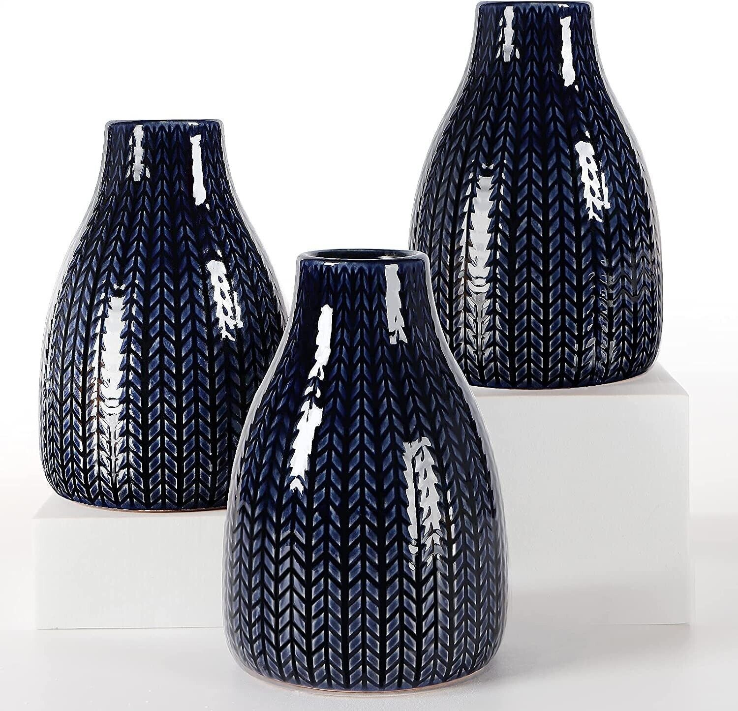 Home Living Room Decor Set of 3 Small Dark Blue Stoneware Ceramic Flowers Vases