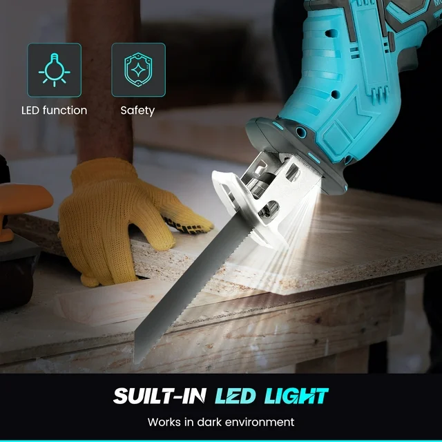 HUKOER reciprocating saw has "two lights" design:①Built-in LED, when you turn on switch, it will automatically light up to illuminate the work area. ②With the power indicator, it's convenient for you to check the current battery level to prompt you to charge in time.
