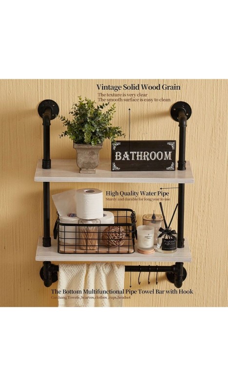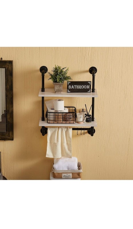 Industrial Pipe Floating Shelves - 20" w-Solid Wood Planks and Towel Bar-Rustic