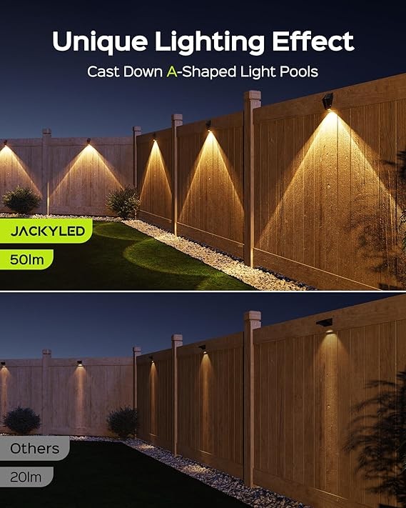 • 【Unique A-Shaped Lighting】Designed by JACKYLED professional lighting engineers, this solar fence lights cast down beautiful A-shaped light cones on your patio fences or wall and ground, adding a touch of welcoming delight to your outdoor backyard. Whether you are playing with your kids or walking the dog, these solar powered deck lights are always standing by to witness your happiness.