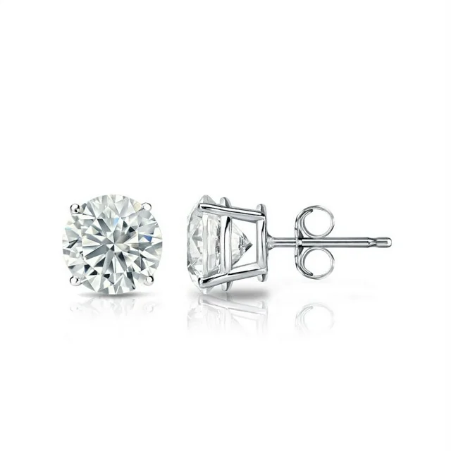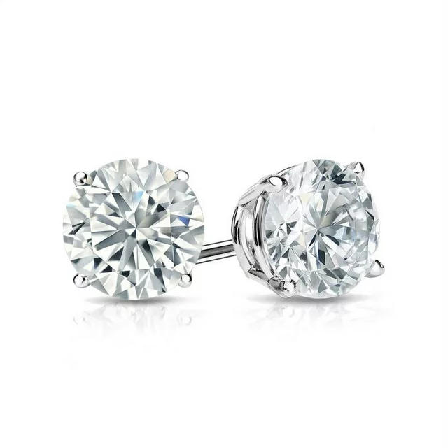Make every day a cloud nine day with these 4 Prong 2 Carat Round Shaped Moissanite Solitaire Stud Earrings In 18K White Gold Plating Over Silver. Professionally handcrafted into a fine round cut by our experts in lapidary, these splendid moissanite earrings are composed of 2 carat moissanite on white gold plating over silver, and each side of the earrings weighs 1 carat. Special and non-traditional, these solitaire stud earrings is well-suited for those who are not quite into normal lifestyle. With naked eyes moissanites look, shine and feel exactly like diamonds. With its splendor, these moissanite earrings will absolutely enhance every style of its wearer. These moissanite stud earrings are beautiful and accessible since it is available at an affordable price. Moissanites�are the most popular alternative gemstone for�diamonds�while being at lower and more affordable price. Considered as a symbol of timeless love and affection for your lover, these moissanite stud earrings , the birthstone earrings for April, symbolically representing strength and an unbreakable love, will be the greatest choice you will ever make. Also, these moissanite solitaire earrings can be customized, so customers can choose one of metal colors between 18K rose gold plating over silver, 18K white gold plating over silver, and 18K yellow gold plating over silver. In regards to its hardness,�moissanite�is almost as hard as�diamond�which means that it is notably durable. Let's fulfill your love story with these solitaire stud earrings and, surely, she will not regret it.