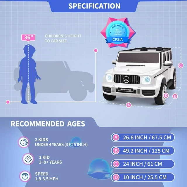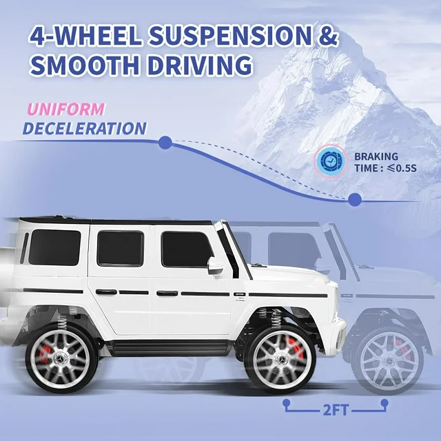 Joywhale 2-Seater Kids Ride on Licensed G63 has almost restored the real car's appearance, the luxurious and realistic appearance can give kids an excellent driving experience. And equipped with large 2-seater & powerful power configuration, which can provide strong power on various terrains for two kids. The 20" extended seat can give kids more comfortable driving experience. Kids also can enjoy a comfortable and smooth driving thanks to the four-wheel suspension and the soft braking system. The bumps on rough roads and the shock during braking can be significantly reduced. The seat belt and safety door lock can also protect little drivers' safety. Additionally, there is an emergency brake button on the remote control, which can stop the car immediately in case of an emergency. And it also provides various functions, Music/ FM Radio/ Bright Headlights/ Horn and more, kids can enjoy the fun of lights and music while driving. At the same time, it comes with a portable handle and folding wheels for easy carrying.