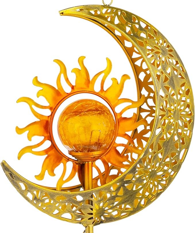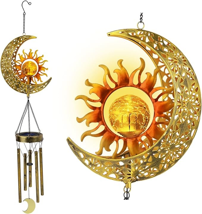 ?Unique Design - Our LED solar light wind chimes designed into the shape of the moon. Being made of the premium material makes the Unique windchimes waterproof. Retro moon crackle glass ball wind chimes is composed of premium metal top with S hook, led light surrounded by the Sun shape frame and 5 bronze waterproof aluminum tubes. The beautiful wind chimes design spice up your garden, Garden, Yard, Patio and Lawn.