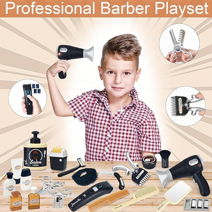 • Realistic and fun Kids Barbershop Playset: This shaving hair salon toy set includes 23 Pcs kids barber set toys, including Hair Spray, Mirror, Brush, Cleaning Brush, Hair Clipper, Rolling Razor, Replaceable Blade*3, Hand Shaver, Hair Oil, Shaving Cream, Manual Hairdresser, Blow Dryer, Comb, Scissors*2, Waist Tool Bag, Storage bag, perfume bottle and other boy salon styling accessories for your kid.