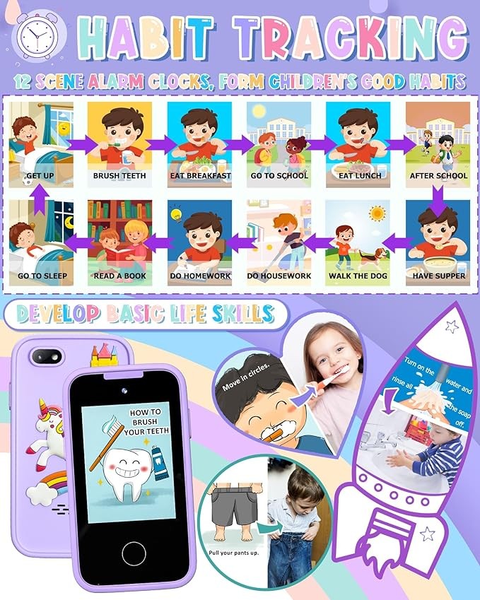 • 【ALL IN ONE KID'S SMART PHONE】: With 23 entertainment, educational, and practical functions including games, drawing, music, taking photos, letter cards, habit tracking, audio books, calendars, etc., this smart cell phone meets all kids’ needs. School mode allows parents to control playtime. Kids can customize the phone from 31 wallpapers and 11 themes.