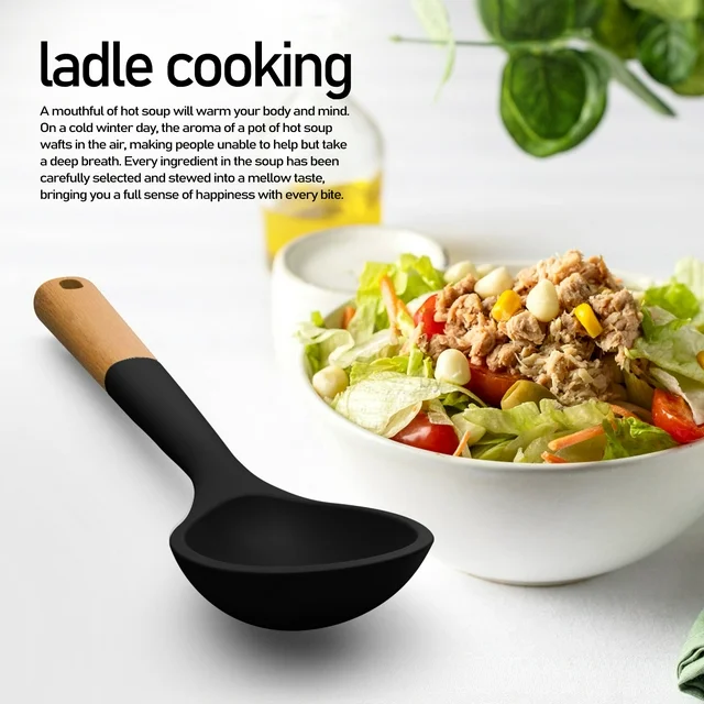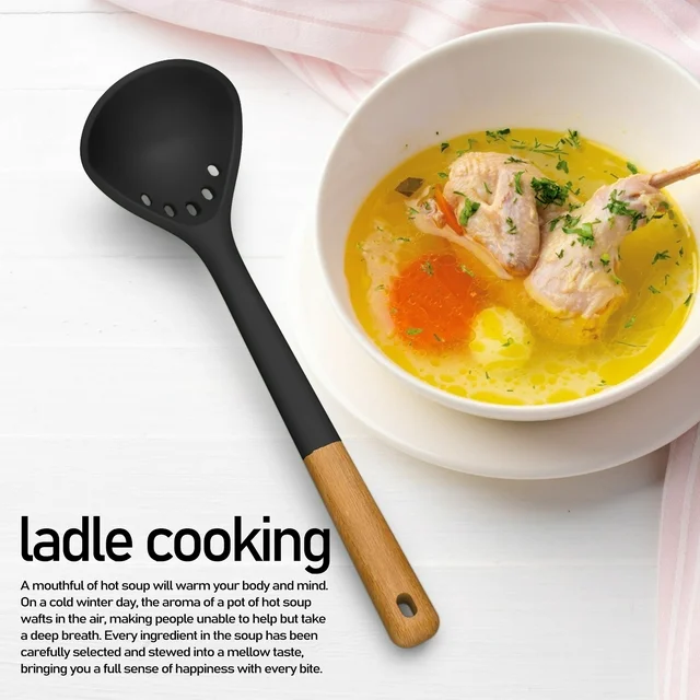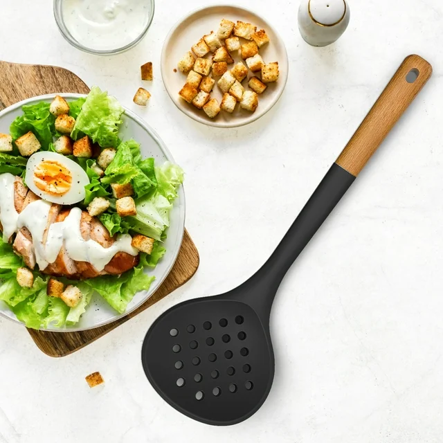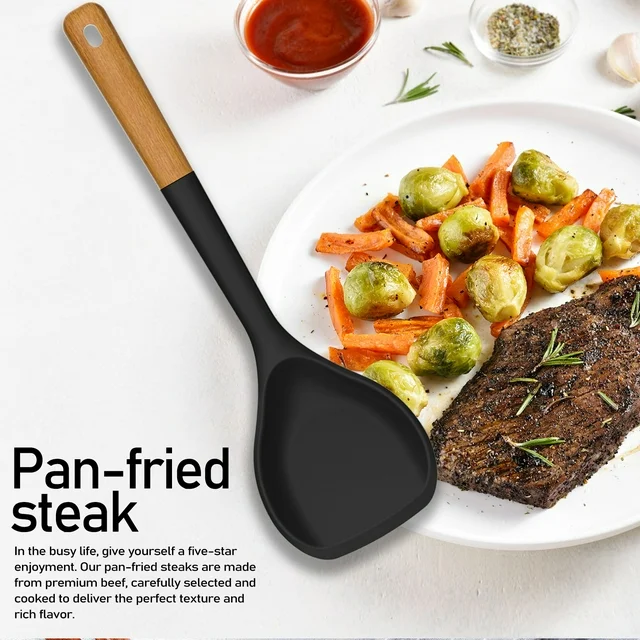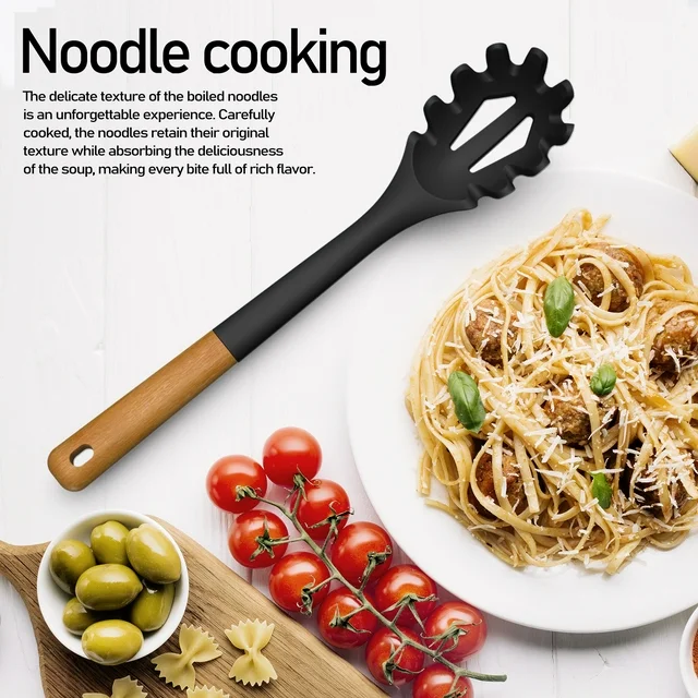 Large Silicone Cooking Utensils - Heat Resistant Kitchen Utensil Set with Wooden Handles, Spatula,Turner, Slotted Spoon, Pasta server, Kitchen Gadgets Tools Sets for Non-Stick Cookware (Black)