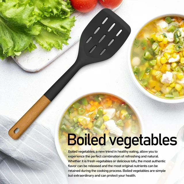 New kitchen utensils set design in 2022, what improvements have we made? Below is our collection of user feedback on all wood-handled cooking utensils on the Walmart platform 1: 43.2% of users complained that the wooden handle would crack during use Improvement: We used high quality solid logs and increased the size of the wooden handle by nearly 2 times 2: 20.81% of users complained that too many products in the set are like toys, small in size and rough in workmanship Improvement: We save the cost of extra products, we focus on improving product quality, we increase the overall size of the kitchen utensils, and thicken the silicone. We don't want to waste your money! 3: 10.3% of users feel that kitchen utensils have a strong smell Improvement: We require our suppliers to produce a test report for food grade silicone. We inspect each batch of silicone raw materials. Must be in full compliance with BPA FREE.