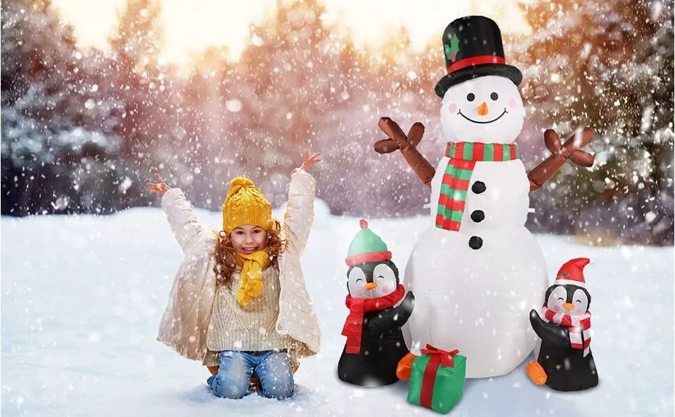 Funny Inflatable Christmas Decorations for the Yard: A lovely 6ft high inflatable snowman with 2 penguins dressed up as a Christmas gift, wearing a Christmas hat, holding a gift, will make your kids squeal with delight and make your yard a big hit around neighbors.