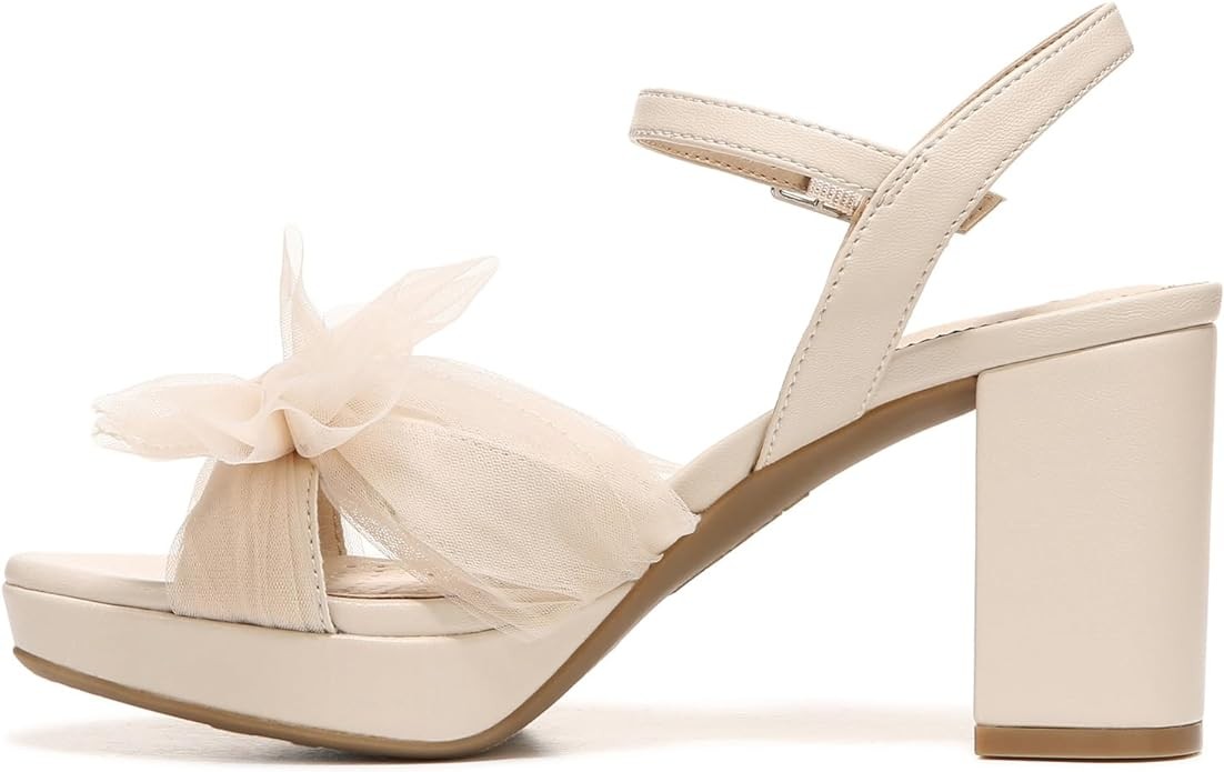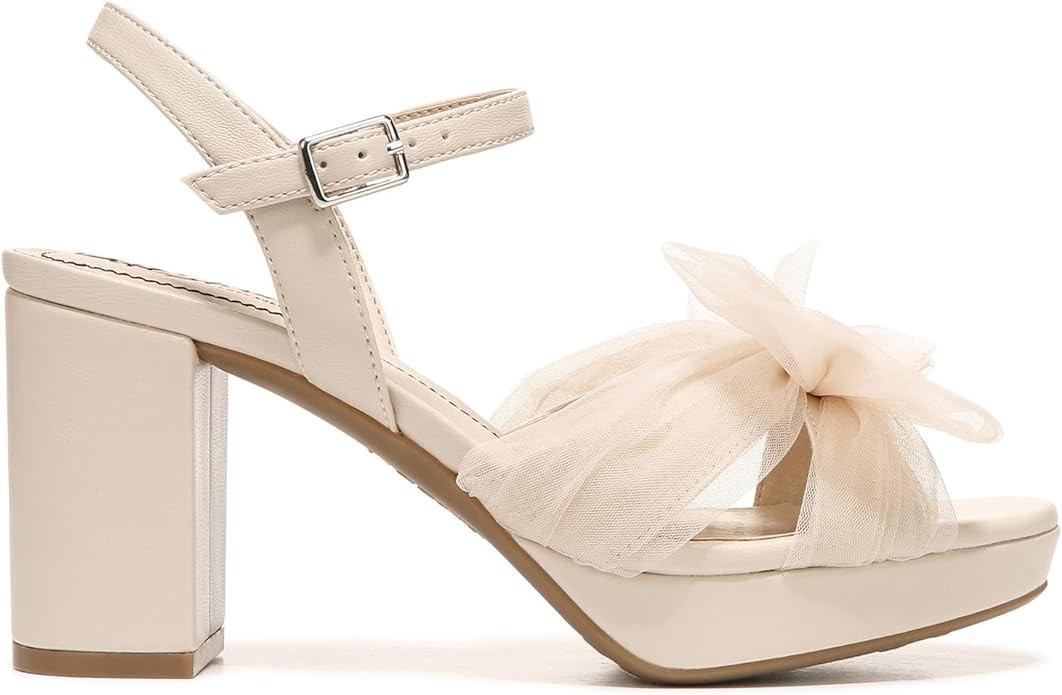 • Faux leather with a round open toe, ankle strap with adjustable buckle and added stretch, and romantic tulle bow detail