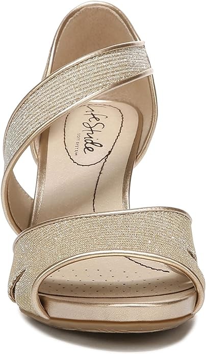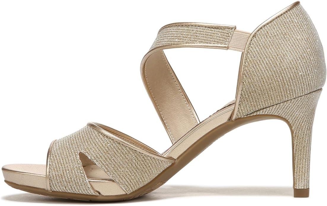 • Faux leather or fabric upper with an open toe, stretch gore panel, and crisscross strap