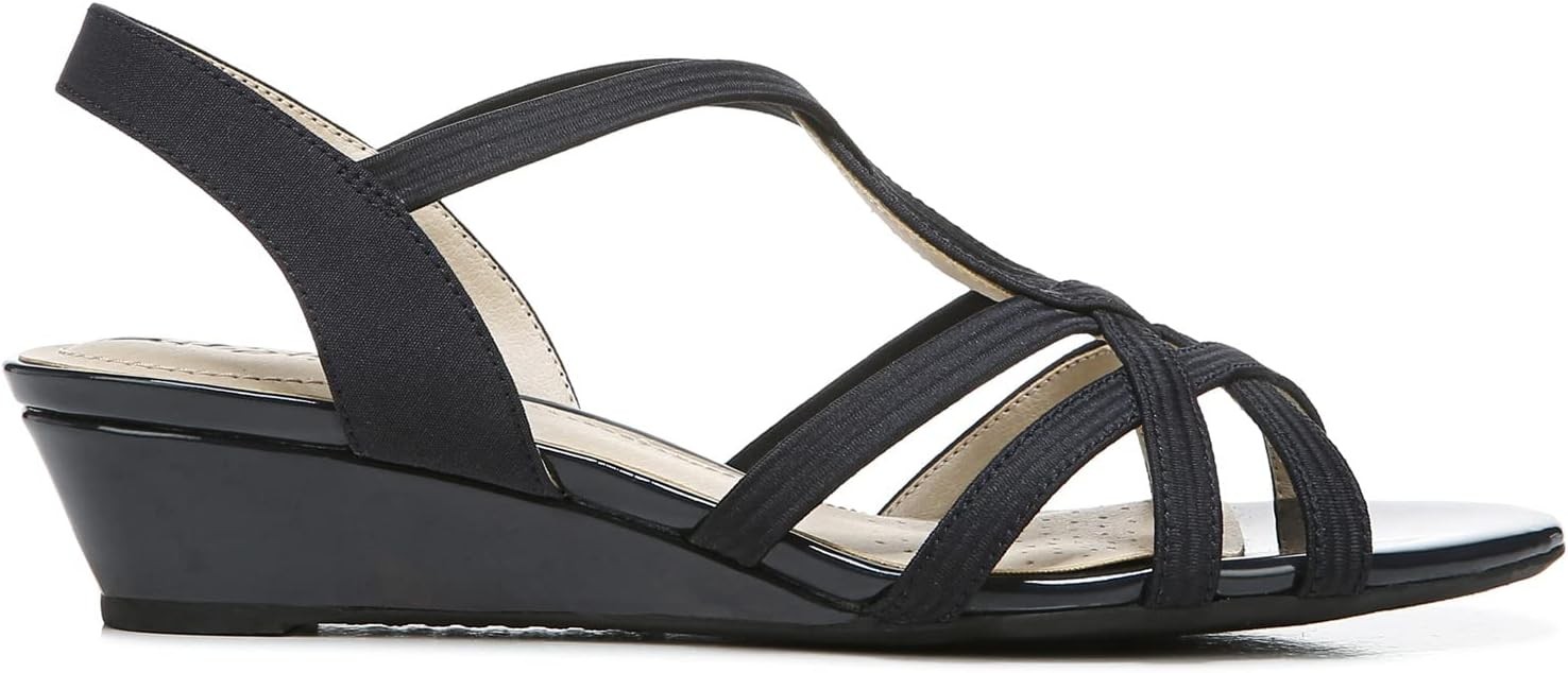 • Fabric upper with an open toe, heel sling strap, and crisscrossing strap detailing