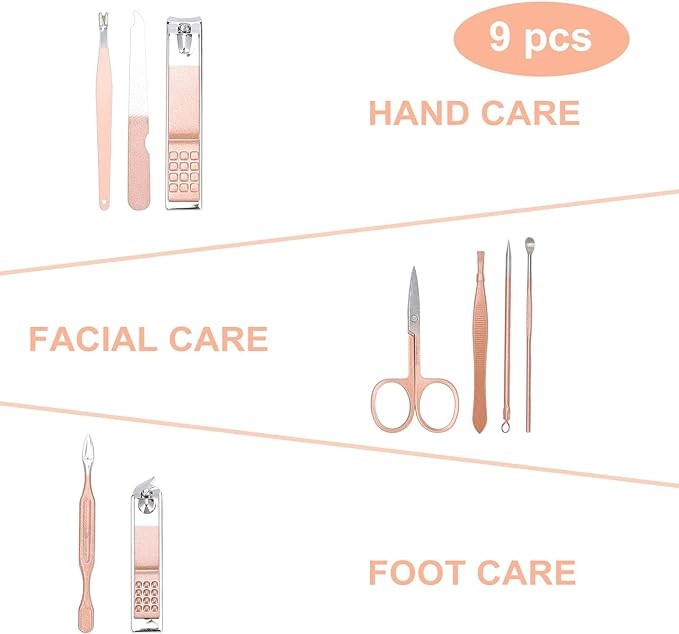 • PERSONAL CARE TOOLS: The high-quality manicure set contains 9 kinds of care tools for hands, feet and face, which can meet your personal care needs, and it is more economical and affordable than buying it separately.