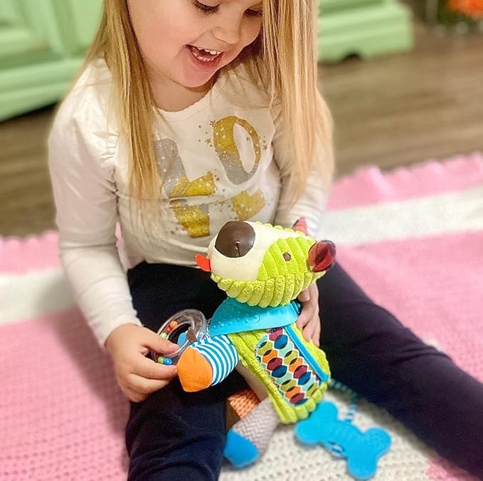 Maple Toys - Furry Friends 5-in-1 Multi-Sensory Toy with Teethers, Rattles, Crinkle Paper and Textures, Removeable Hook for Crib/Stroller, Cute Bell, Great Gift for Birthdays/Baby Showers (Puppy)
