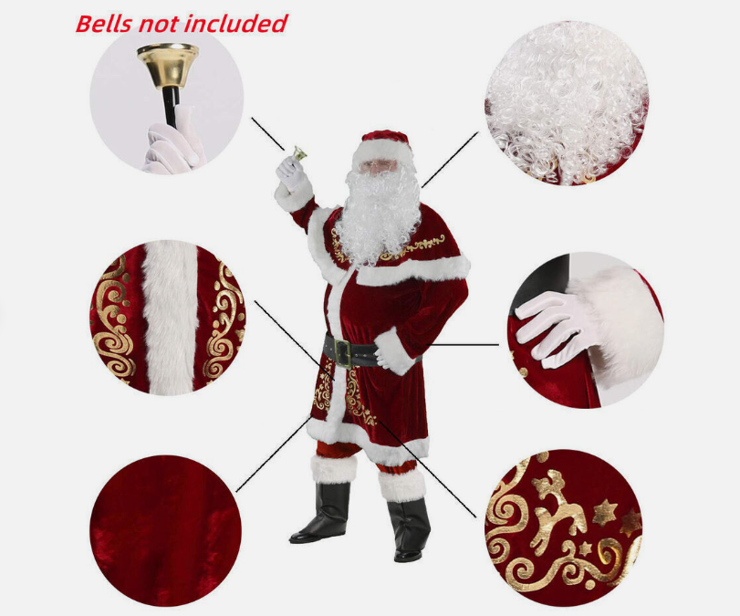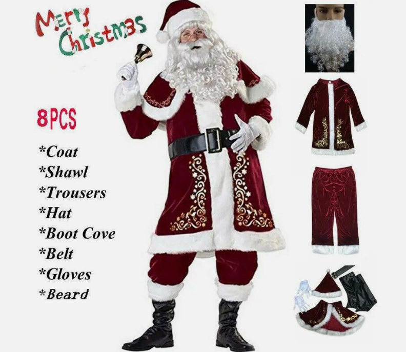 Men's Santa Costume Set 8pcs Velvet Christmas Adult Santa Claus Cosplay Dress Up