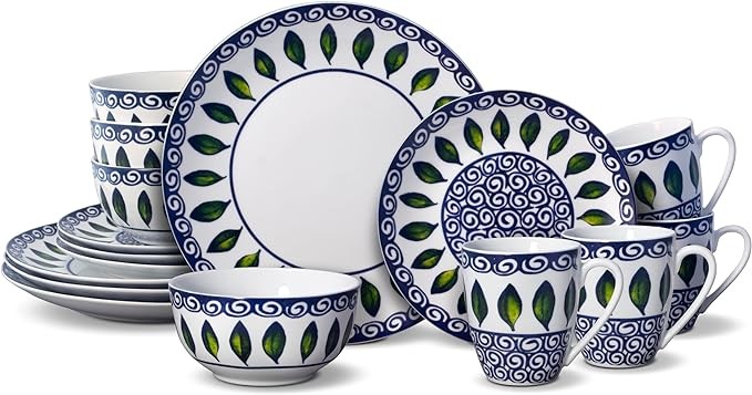 Mikasa Vienna 16 Piece Dinnerware Set | Elegant and Lightweight White Porcelain with Green Leaf & Blue Scroll Design | Service for 4 | Microwave & Dishwasher Safe