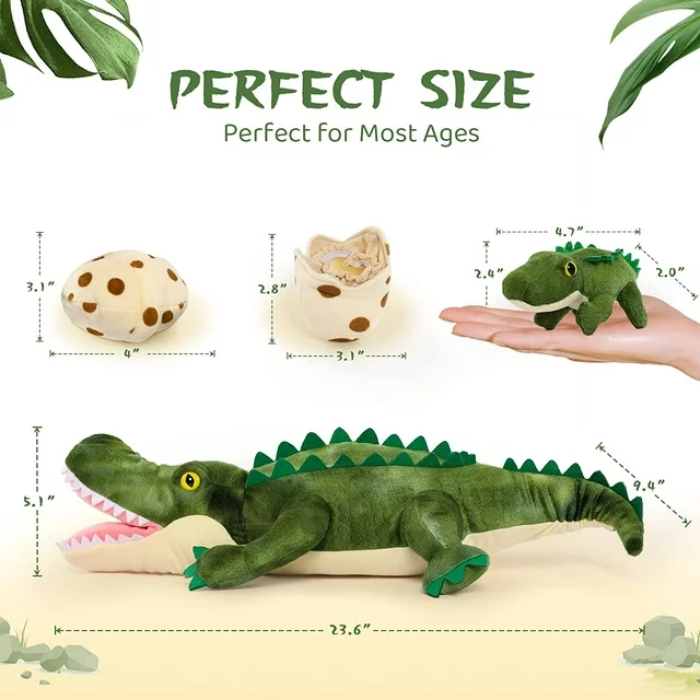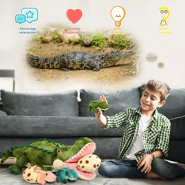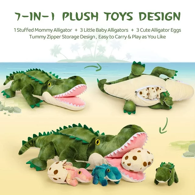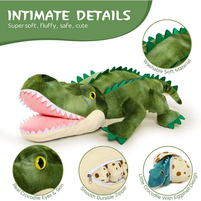 • [PERFECT PARTNER] How fun to help the 23.6''mommy large alligator hatch its 4'' baby crocodile eggs and get about 5'' mini crocodiles! These plush crocodile toys with cute faces, perfect size and belly zipper storage design are amazing! Perfect for all ages to play and carry around. Never worry about getting dirty. Hand or machine washable! Be assured to play, cuddle and sleep with your big alligator and mini alligator toys as you like