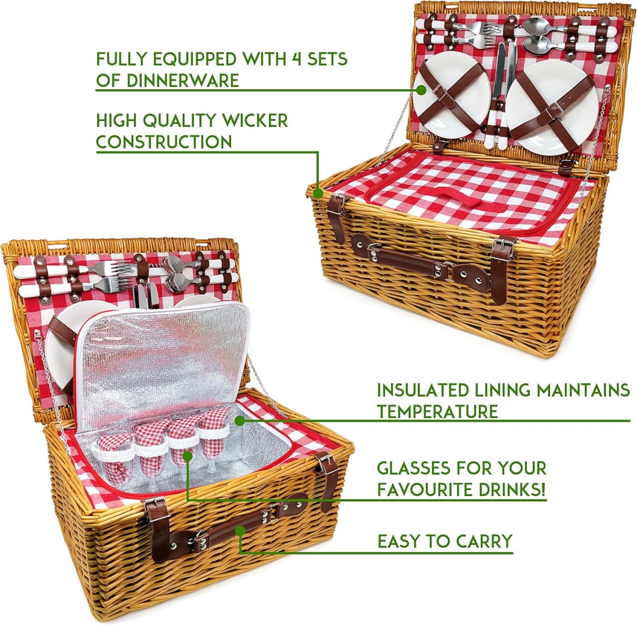 Nature Gear Picnic Basket, Wicker Basket with Handle for Outdoors, Insulated Woven Basket, Includes a Service Kit of Dinnerware & Wine Glasses, Picnic Basket Set for 4, Red & White
