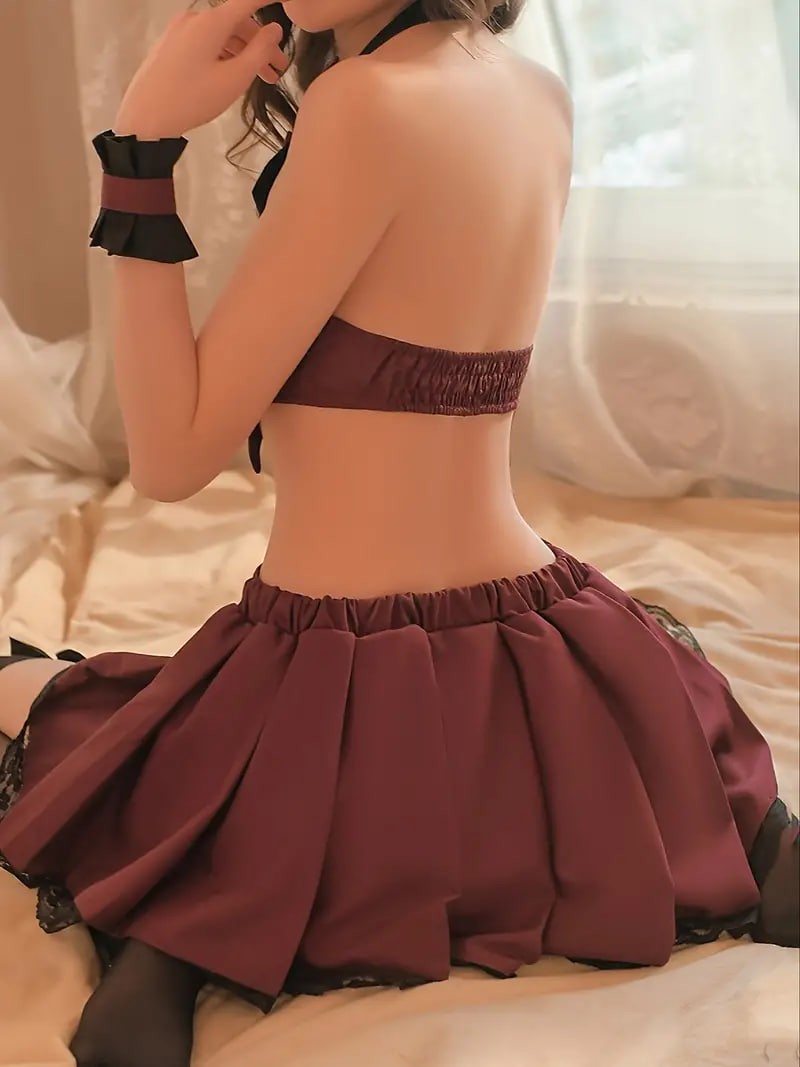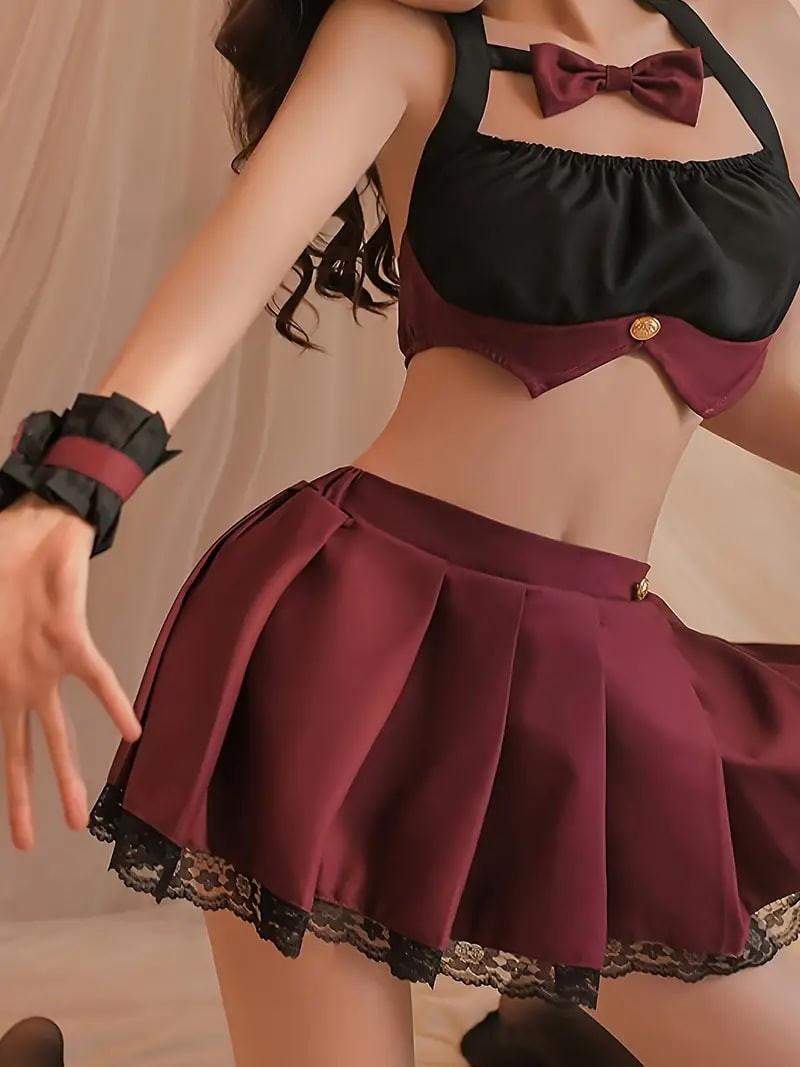Naughty Preppy Cosplay Costume, Colorblock Bow Knot Cut Out Halter Backless Bra & Lace Trim Elastic Pleated Skirt & Cuffs, Women s Sexy Lingerie & Underwear details 0