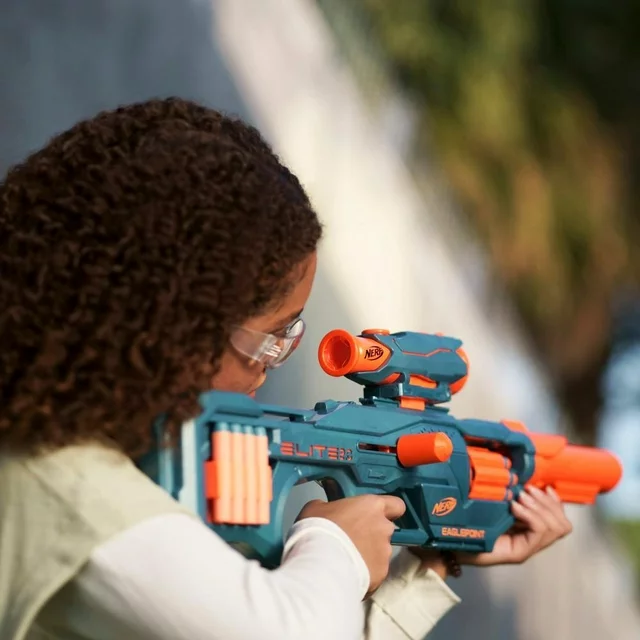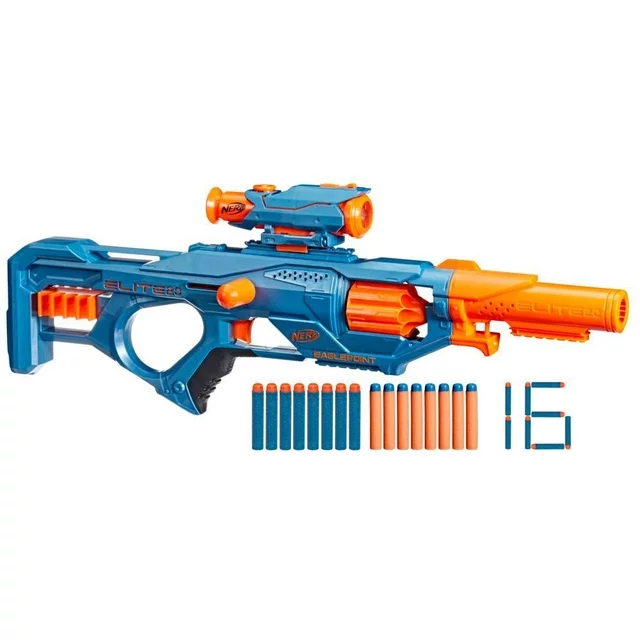 Customize the Nerf Elite 2.0 Eaglepoint RD-8 blaster for any mission! This Nerf dart blaster includes an attachable scope and attachable barrel so you can create different blaster styles as you gear up for Nerf games. Go lean and mean with the core blaster, add the scope to line up your targets, add the barrel for distance targeting -- you're ready for whatever the battle brings with the Eaglepoint RD-8 blaster. The revolving drum has an 8-dart capacity. Fire 8 darts in a row, then reload fast from the onboard dart storage that holds 8 darts. This Nerf Elite 2.0 blaster comes with 16 Official Nerf Elite darts -- 8 darts to load into the drum, and 8 darts to store on the blaster. Take aim and send the darts flying through the air up to 90 feet (27) meters. It has 3 tactical rails to add Nerf accessories (each sold separately, subject to availability). Eyewear recommended (not included). No batteries required. Nerf and all related properties are trademarks of Hasbro.•CUSTOMIZE BLASTER FOR ANY MISSION WITH SCOPE AND BARREL: Nerf Elite 2.0 Eaglepoint RD-8 blaster includes a detachable scope and barrel to create different blaster styles for any mission•8-DART DRUM, BOLT ACTION, FIRES DARTS UP TO 90 FEET: Fire 8 darts in a row up to 90 feet away (27 meters) from the 8-dart revolving drum on this blaster that has bolt-action priming•16 NERF ELITE DARTS, DART STORAGE, TACTICAL RAILS: