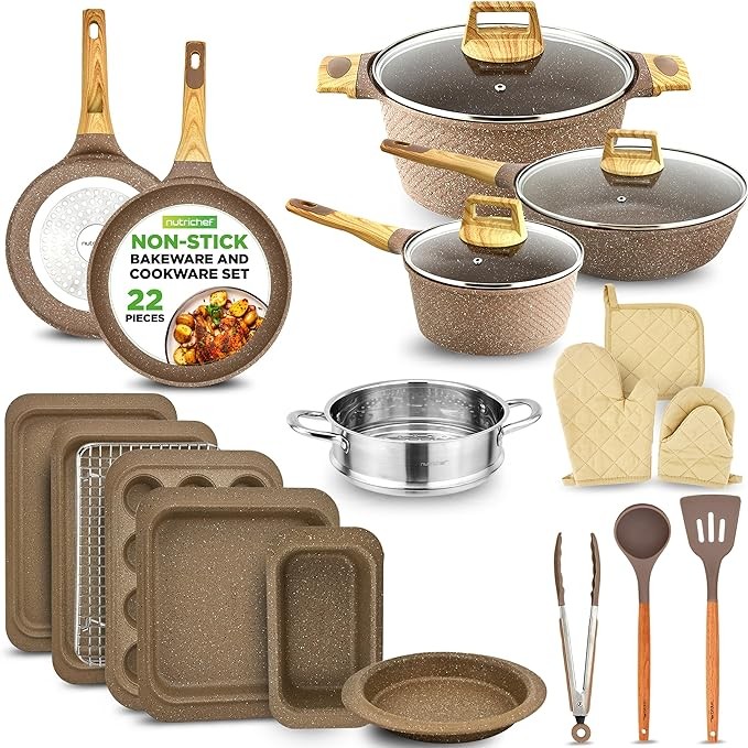 Nutrichef 22-Piece Maroon Marble Non-Stick Cookware and Bakeware Set - Professional Home Kitchen Collection with Multi-Sized Pots, Pans, and Heat-Resistant Tools
