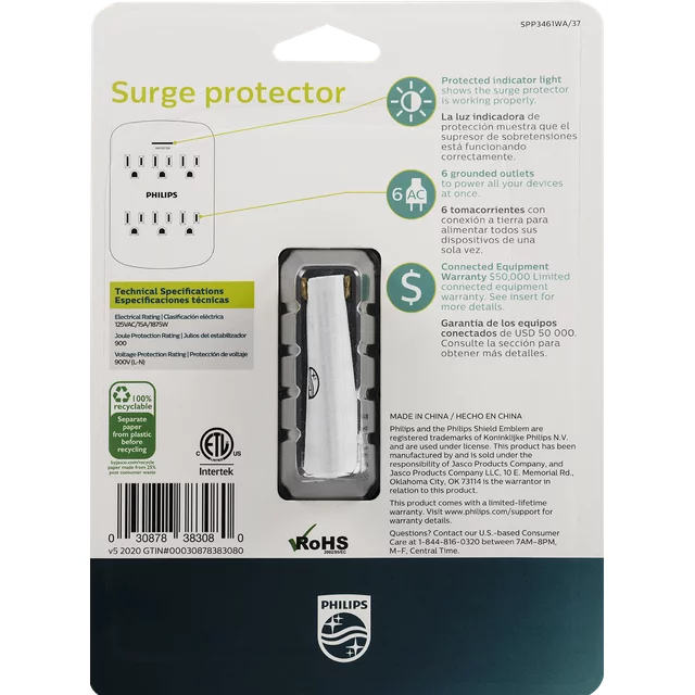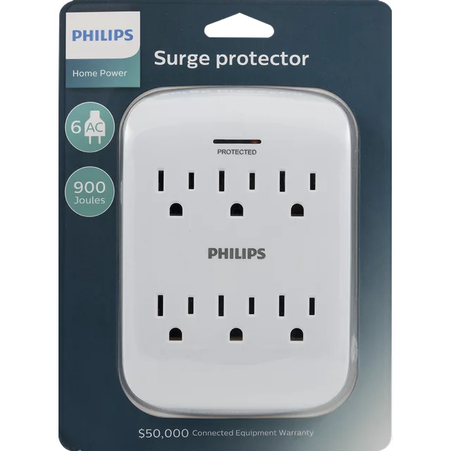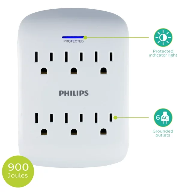 Tap into convenience with the Philips 6-Outlet Surge Protector. Featuring six grounded outlets, this white wall tap transforms your regular three-prong outlet into an efficient charging station. The space-saving design of the wall tap is ideal for any room in your home, regardless of size or setup. In the event of a surge, the wall tap includes 900 Joules of surge protection to keep your connected devices safe from damage, while the LED indicator light stays on to let you know your surge protector is functioning properly. Safe for indoor use with most household electronics, this wall tap features a 125VAC/15A/1875W maximum electrical rating and is ETL listed. Use the wall tap as part of your permanent home or office setup or, for holidays and special occasions, create a centralized location for powering a room’s worth of electronic lights and decorations. Prioritize all of your devices at once with the Philips 6-Outlet Surge Protector.