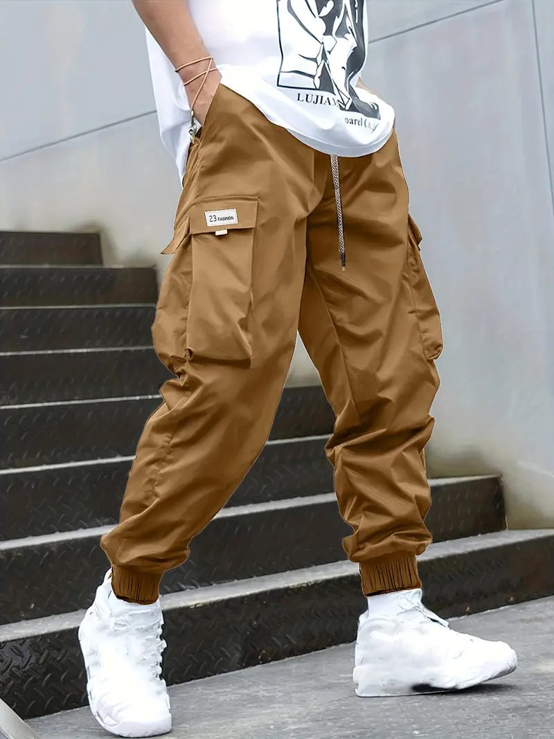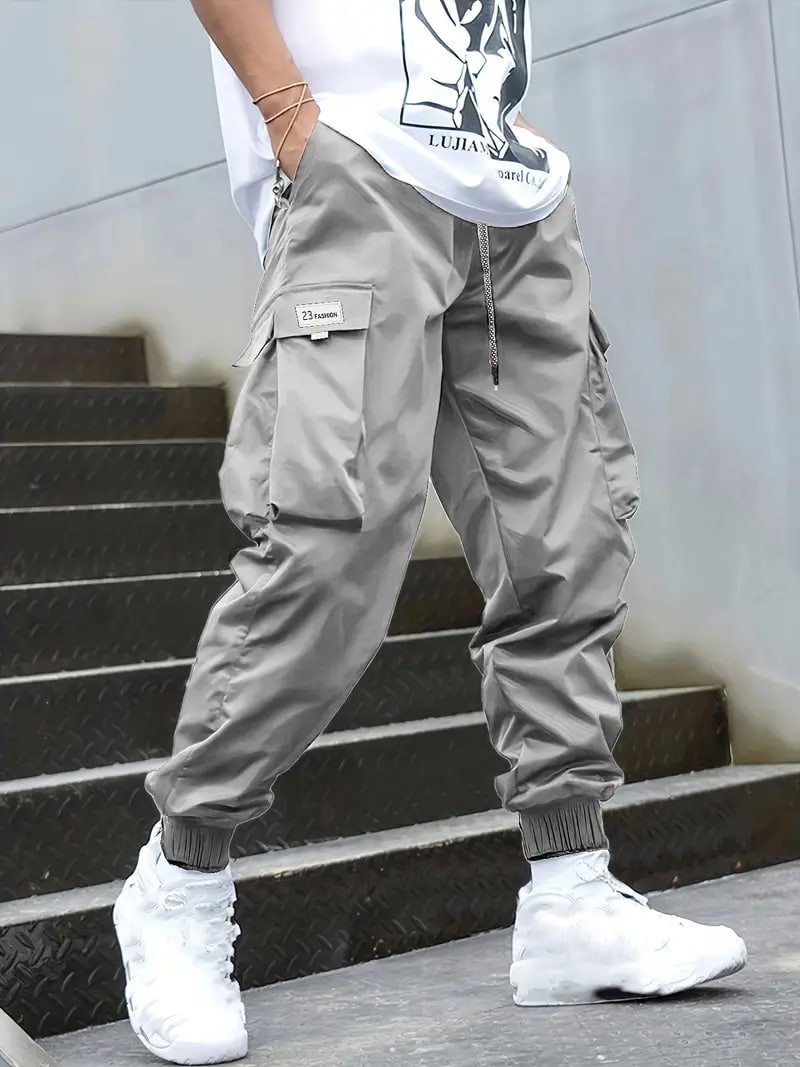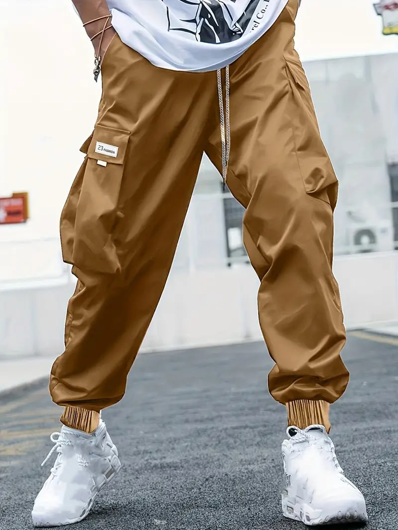 Plus Size Men's Drawstring Cargo Pants: Letters Print, Multi-Pocket Design, Perfect For Outdoor Activities