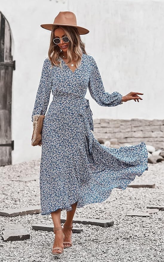 • UNIQUE DESIGN: Boho long dresses for women/High split maxi dress/Long sleeve maxi wrap dresses for women/Long flowy dress for women/Wrap v neck maxi dress/Casual beach long dresses/Long wrap dress with ruffles