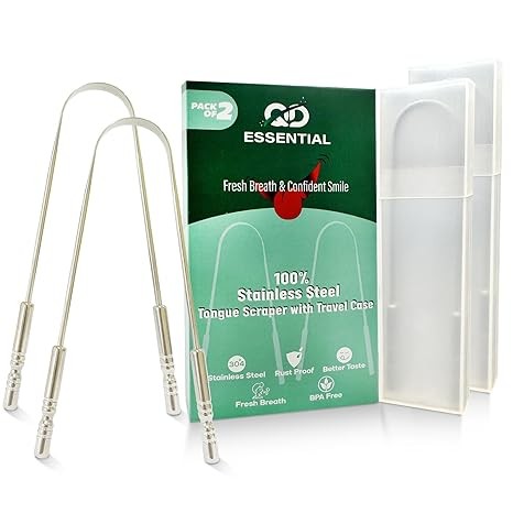 QD Essential Stainless Steel Tongue Scraper for Adults with Travel Case (2 Pack) – Stainless Steel Cleaner for Daily Hygiene, Reduce Bad Breath – Oral Care Travel Essentials, Metal Tongue Scraper