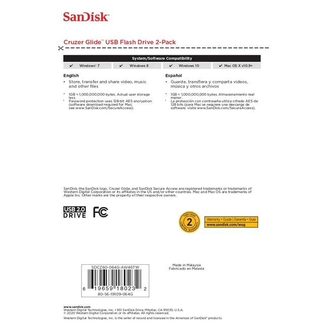 SanDisk 64GB Cruzer Glide USB 2.0 Flash Drive 2 Pack - SDCZ60-064G-AW46TW