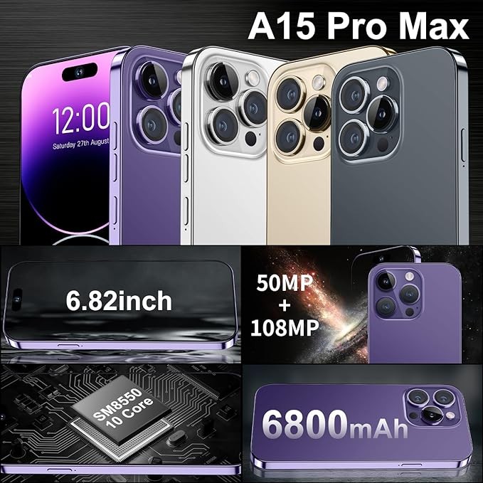 • ✅【6.8" HD Android 13 Smartphone】Please note that the A15 Pro Max is an android phone with a 6.82" HD display and 3200x1440 resolution, bringing you a cinematic experience. Paired with a 120Hz refresh rate, ensuring that you can complete all actions without delay. The unlocked smartphone with face unlocked and Android 13 OS to protect your privacy