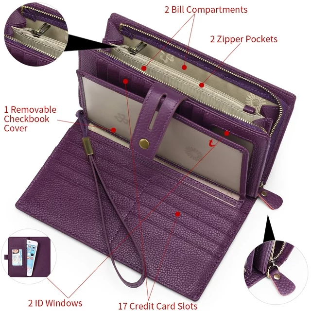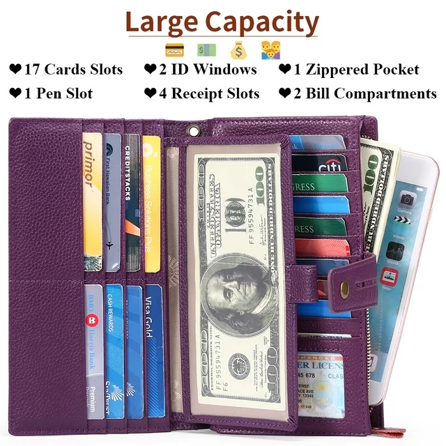 【LARGE CAPACITY OVERSIZE WALLET】17 credit cards, 2 ID windows, 1 passport pocket (can fit 2-3 passports), a removable checkbook cover with 1 pen holder(can use as a checkbook wallet), An exterior zippered pocket reveals 2 additional pockets for storing cash, cellphone, and a zippered coin pouch.