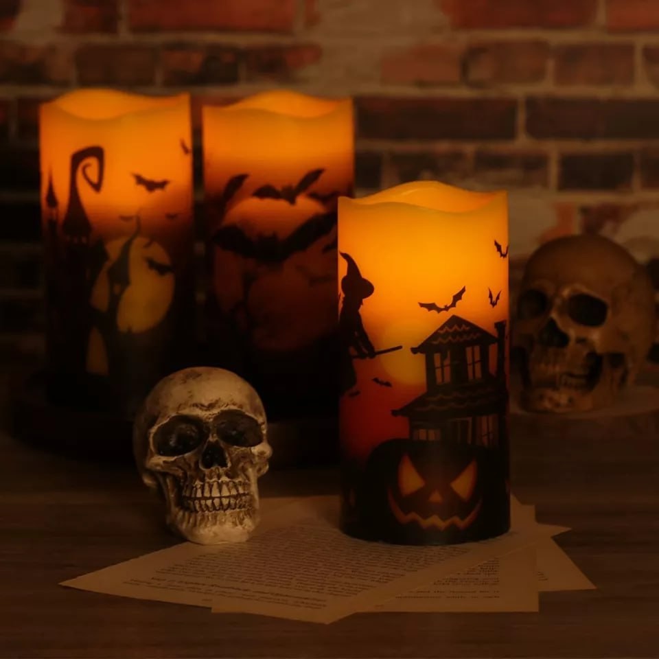 Set of 3 Halloween Flickering Flameless Candles with Remote and Timer, Real W...
