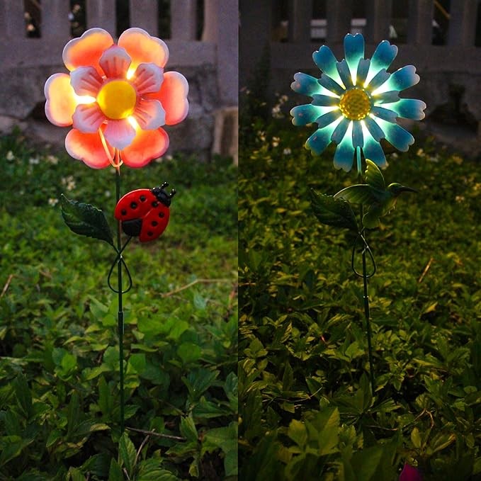 • ?[Newly upgraded Solar]:4 pack metal outdoor flowers garden stakes decorative made from high grade rust-proof. It's as beautiful as a real flower during the day, and at night it automatically gives off a warm glow to decorate your garden, patio, backyard, yard, porch, and walkway.