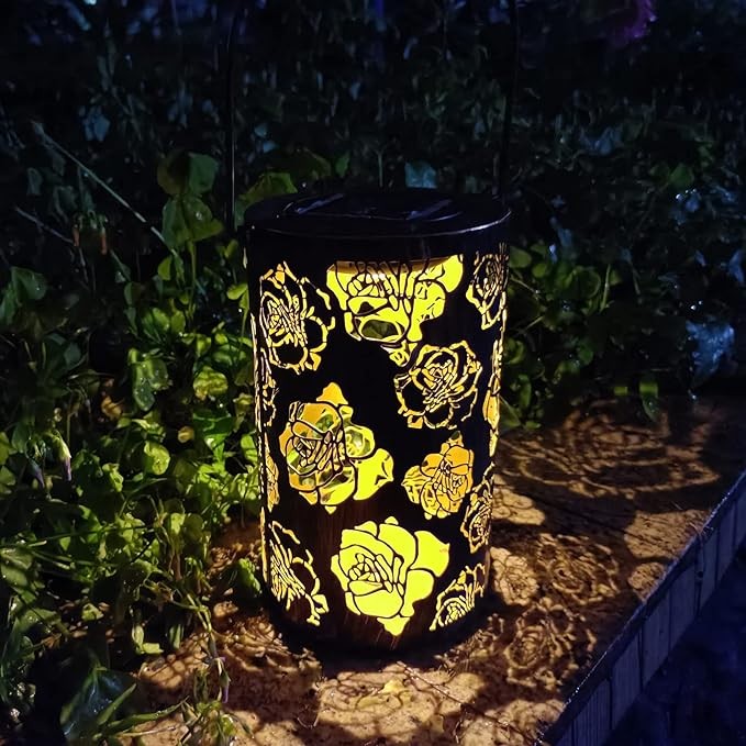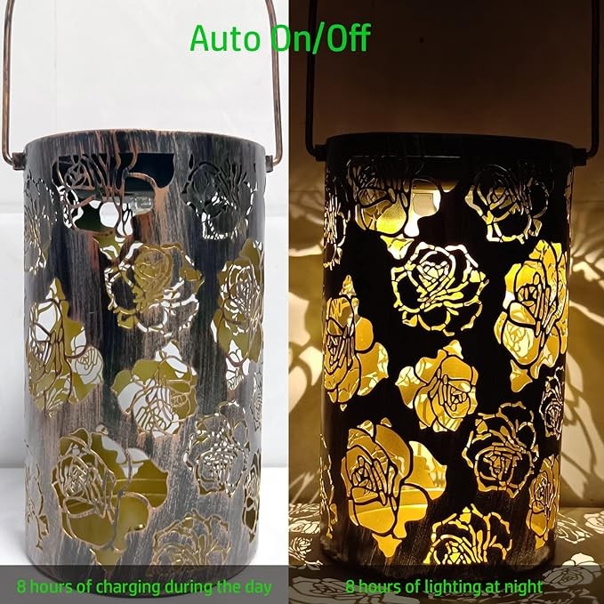 • Roses Solar Lantern - Beautiful Stenciled roses flower shaped Solar Lights Lantern projects illuminated charming patterns at night and creates a subtle warm glow and wonderful ambiance to any space.