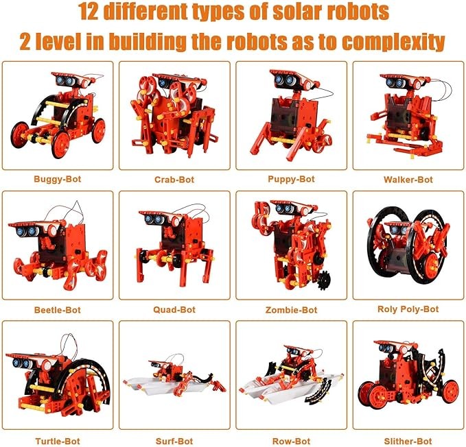 • 【12-in-1 solar robot kit】:190pcs. 12 different robots for your child to build, challenge their DIY manipulative skills. The great robot toy will encourage your children to learn from the game.