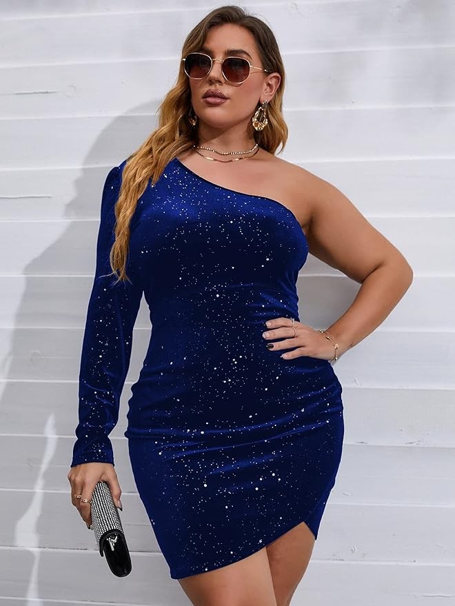 SOLY HUX Women's Plus Size One Shoulder Long Sleeve Ruched Wrap Velvet Bodycon Dress