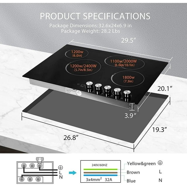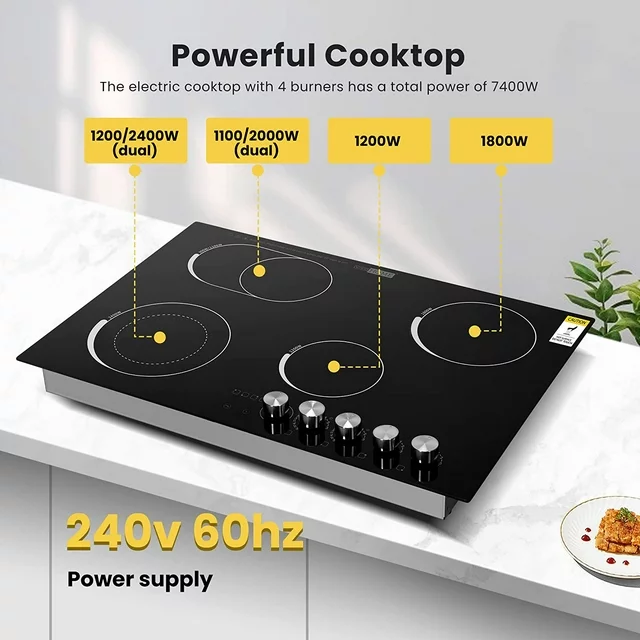 • POWERFUL COOKTOP - The 29-inch electric cooktop with 4 burners has a total power of 7400W; 4 burners can work simultaneously, 2 of which expandable heating elements ensure quick boiling, providing an efficient cooking experience; 5 power levels easily control the temperature and meet your various cooking needs; The power supply of cooktop is 240V, 60Hz