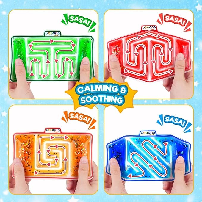 【4 Pack Squishy Fidget Sensory Toys】Squishy sensory toys not only have a twisted maze-like design, but they are also filled with a one-of-a-kind mixture of goo, glitter, and beads that rush and gush back and forth with every squeeze.Our adorable kids sensory toy showcases a mesmerizing flow of liquid accompanied by the delightful "sasa" sound of colliding beads.
