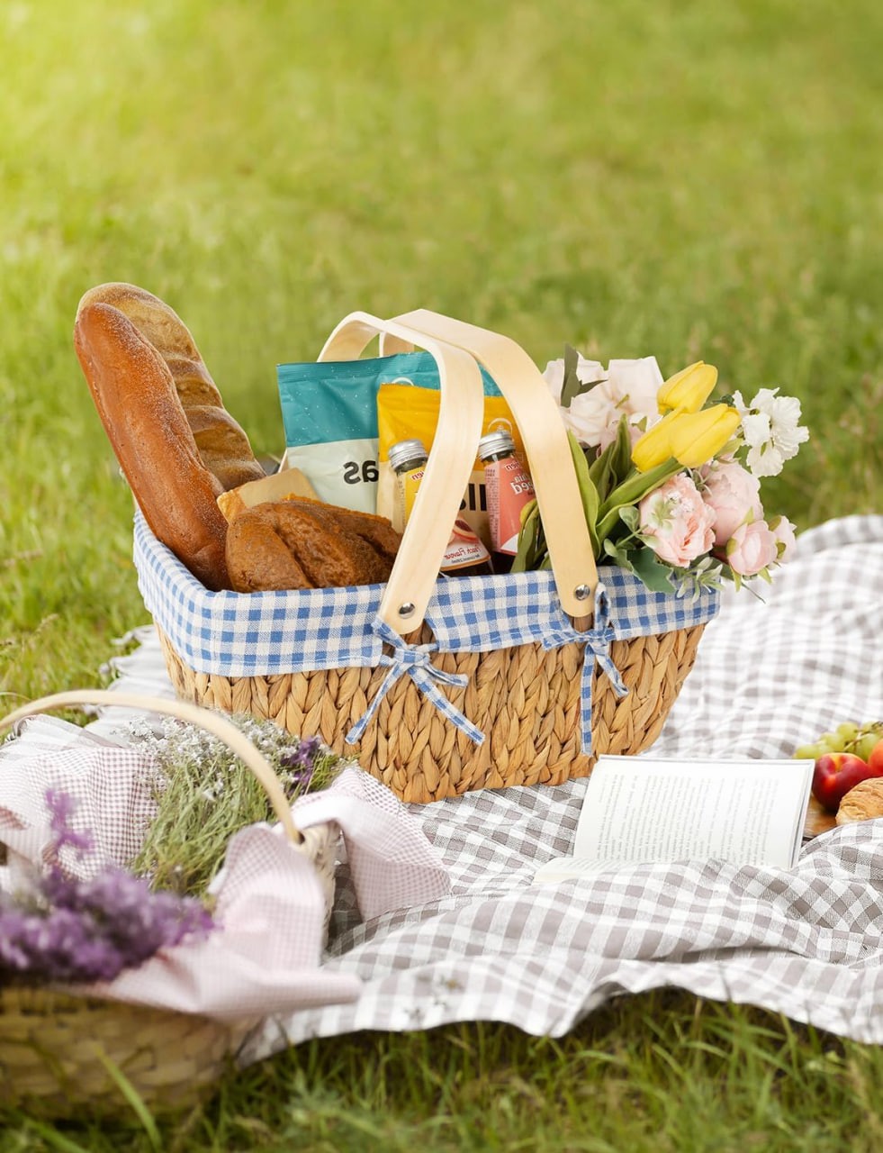 StorageWorks Wicker Picnic Basket for Couple, Picnic Basket with Wooden Handle and Washable Liner, Handwoven Natural Water Hyacinth Picnic Hamper for Camping, Outdoor, Christmas, Thanks Giving