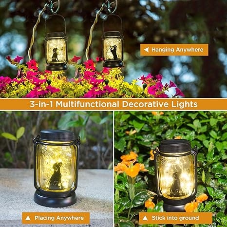 • 【Interesting outdoor/indoor decoration】On a quiet night, the lovely Mason bottle will help to light up your yard and room. The clever and lovely dog in the garden fell in love with the beautiful and free butterfly. Romantic and warm pictures make your garden full of unique fun. It is even like a night light, illuminating your heart and making you happy.