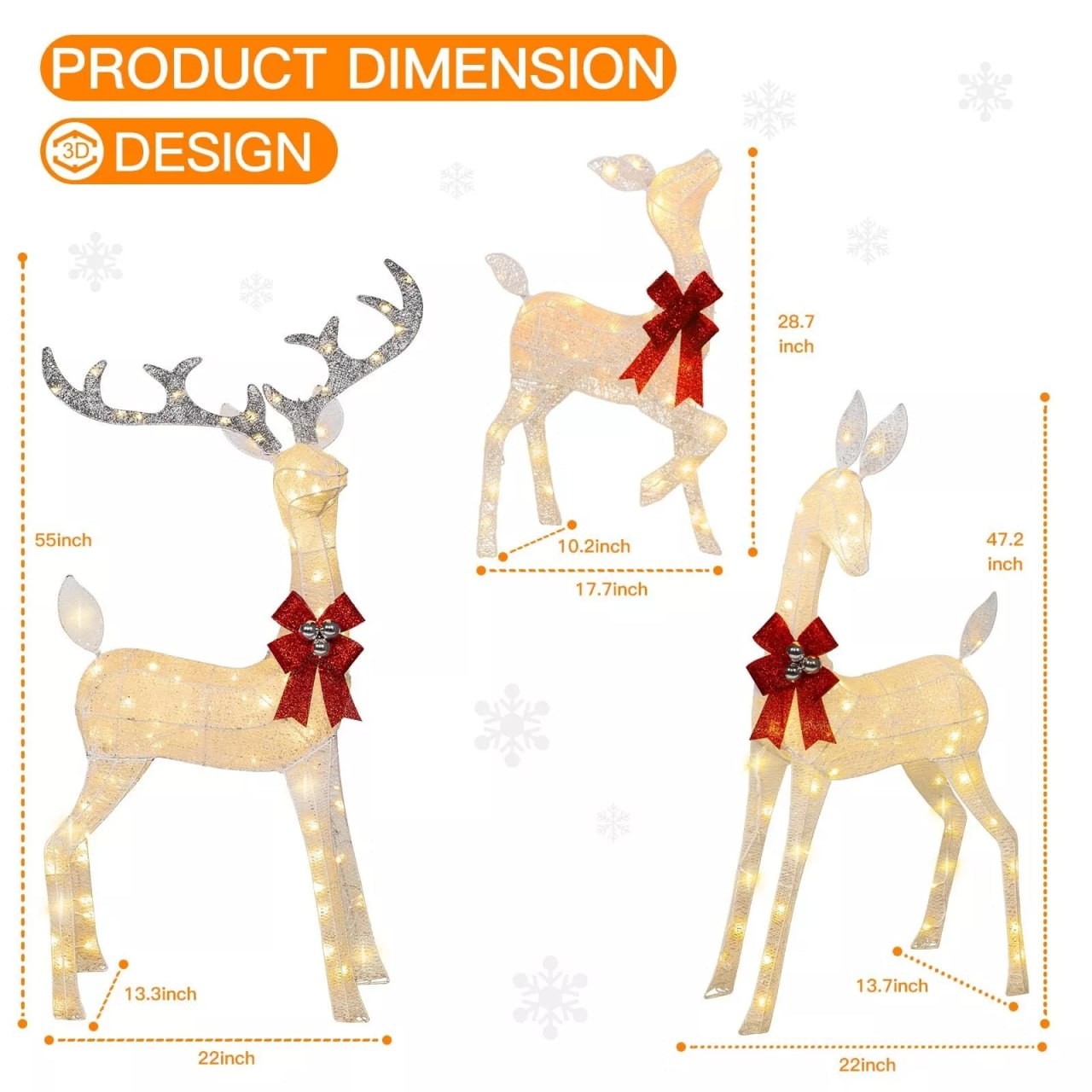 Elegant Details: Celebrate the season with a heartwarming snapshot of a deer family, intricately designed with festive details like shining red bows and a shimmery fabric; BUCK DIMENSIONS: 23.6"(L) x 11"(W) x 51.2"(H); DOE DIMENSIONS: 22.8"(L) x 11.8"(W) x 47.2"(H); FAWN DIMENSIONS: 18.5"(L) x 6.3"(W) x 27.5"(H)