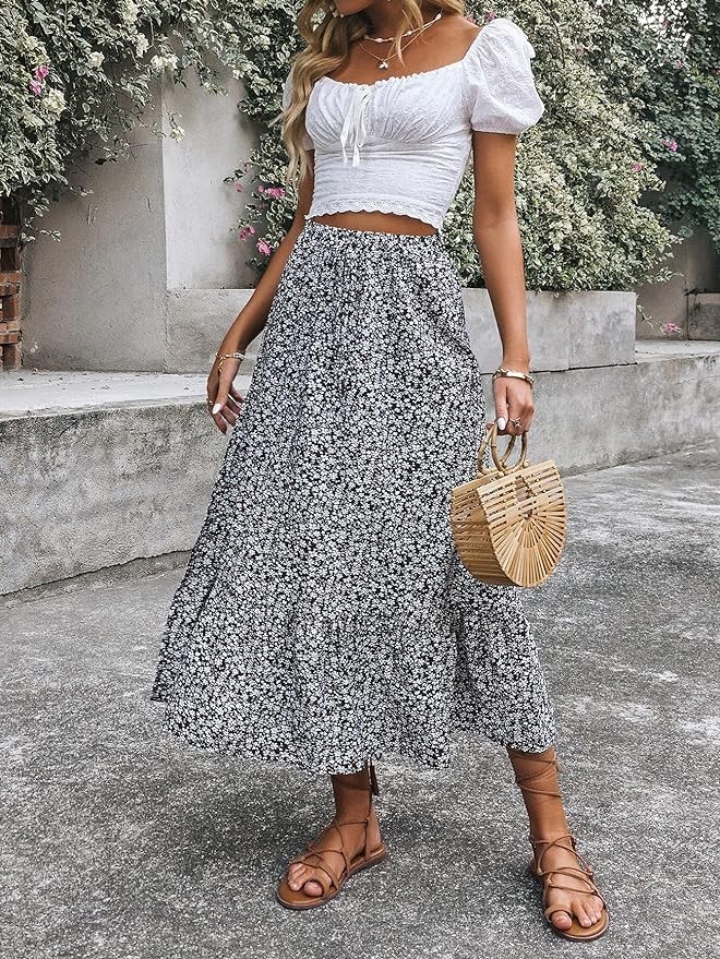 SweatyRocks Women's Casual High Waist Floral Print Skirt Split Thigh A Line Maxi Skirts