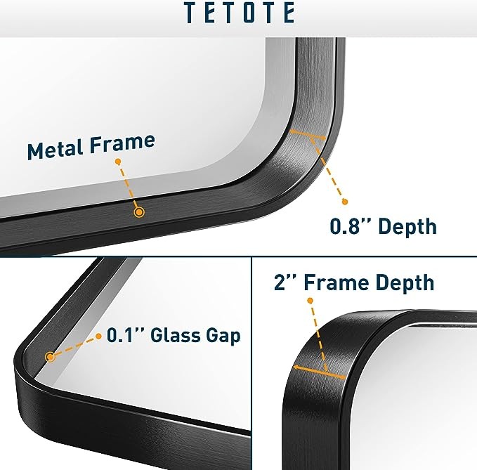 • ✨【Practical and decorative framed mirror】TETOTE's 22 x 30 inch bathroom wall mirror is made of HD glass and premium metta black metal frame. Rectangle shape with round corner of the framed mirror features the modern style. Meets the decor needs to industry, rustic and modern style of bathroom, bedroom vanity, entryway, farmhouse, hotel or salon