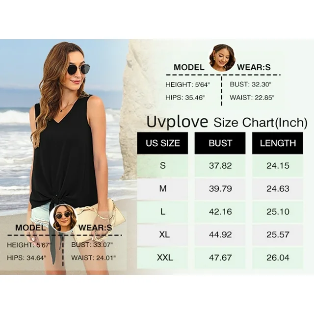 Uvplove Womens Tie Front Chiffon Blouses V Neck for women Sleeveless Summer Tops Shirts,US