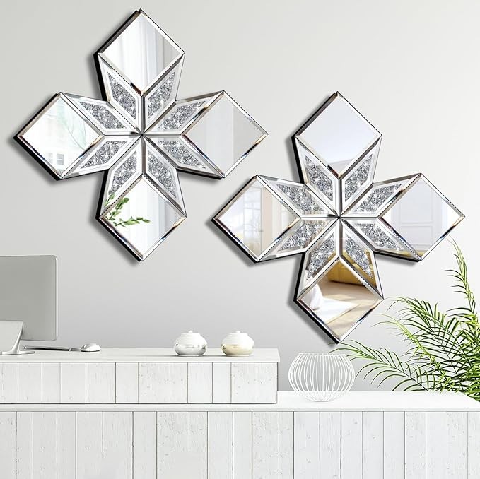 • Crushed Diamond Decorative Mirror Dimension: 16.75x16.75 inches, pack of 2 pieces. Silver Mirror and Crushed Diamond artistically Combination provide stereoscopic feeling for wall decor. Each mirror pieces is bevelled in exquisite craft . Flower leaf style stylish design bring modern fashion element for home decoration. Chic Mirror.