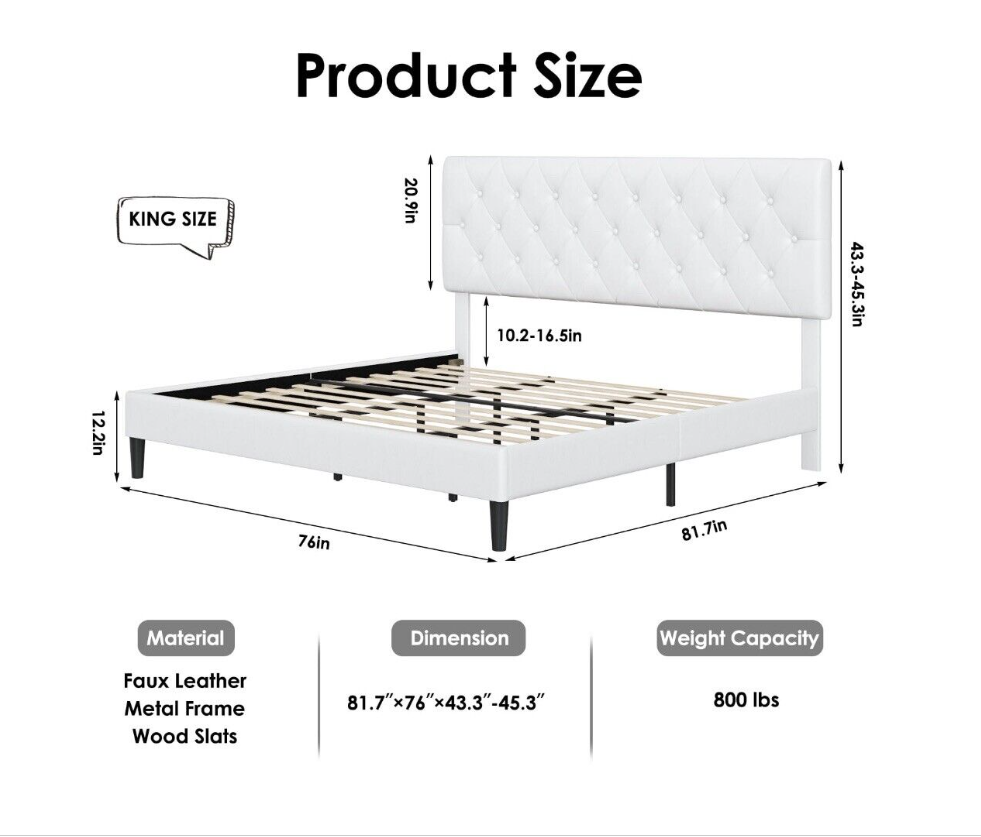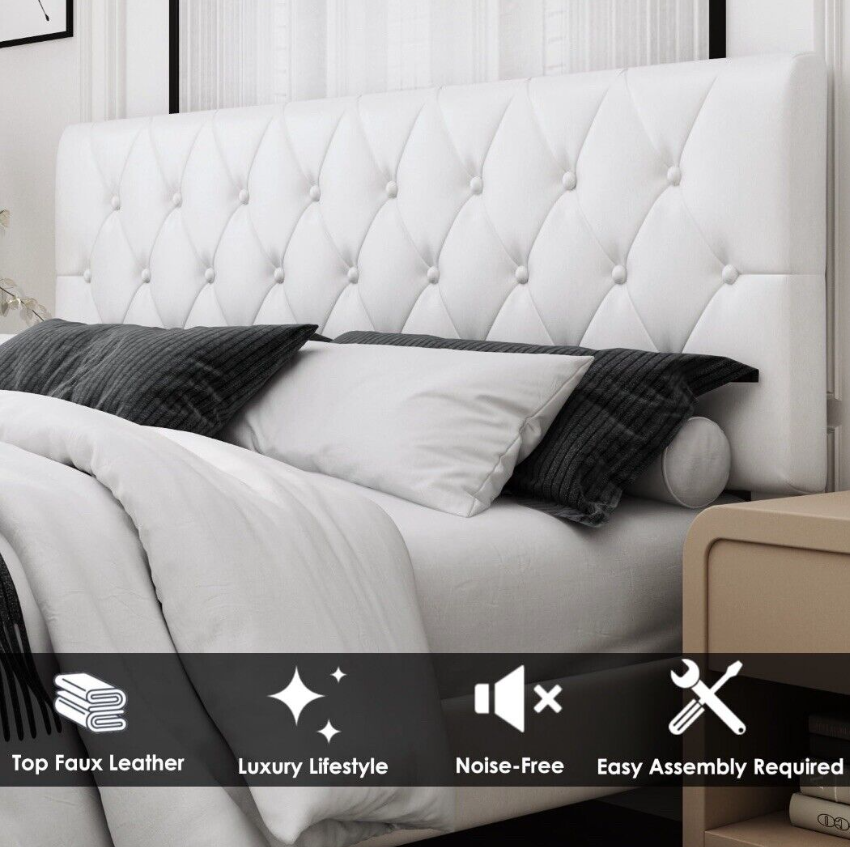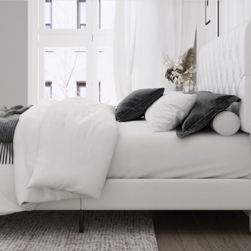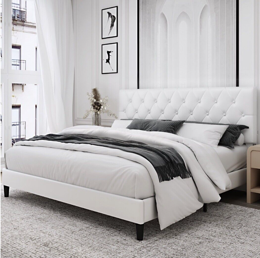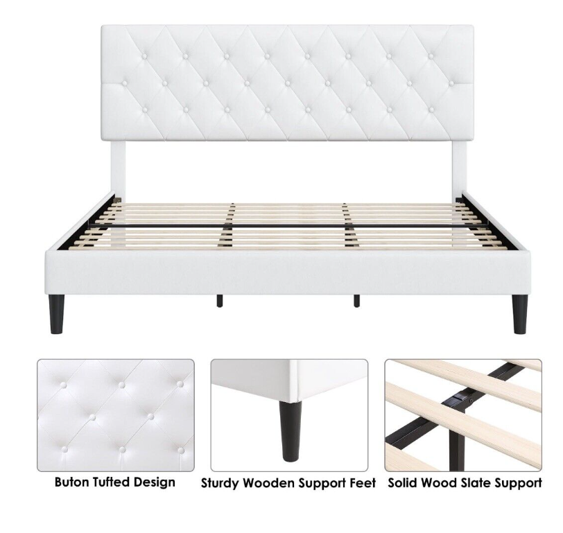 White Faux Leather Upholstered Button Tufted Low Profile Platformed Bed Frame.