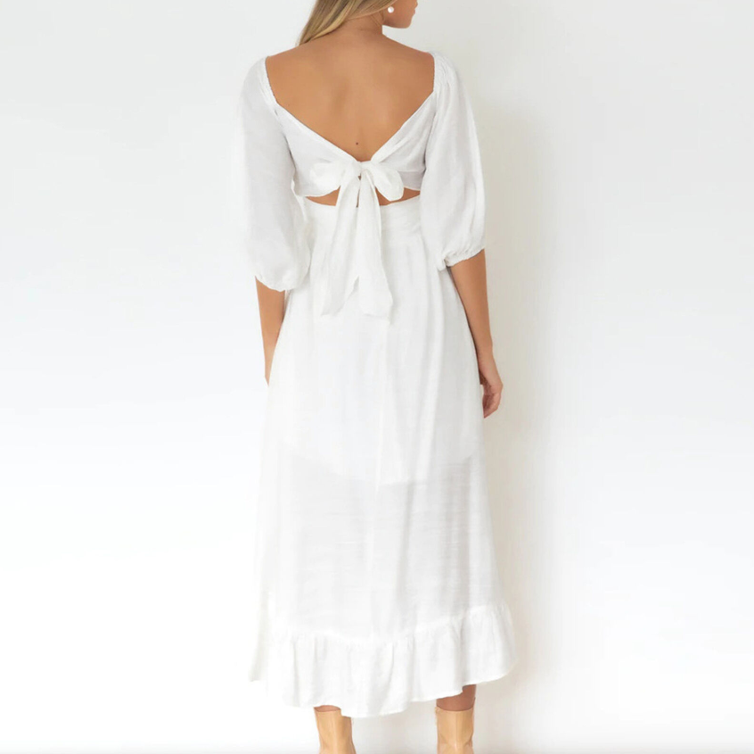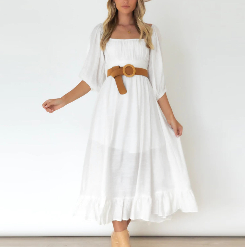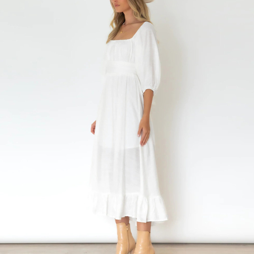 (White XL)Dress Half Puff Sleeve Neck Backless Flounce Hem High HG5