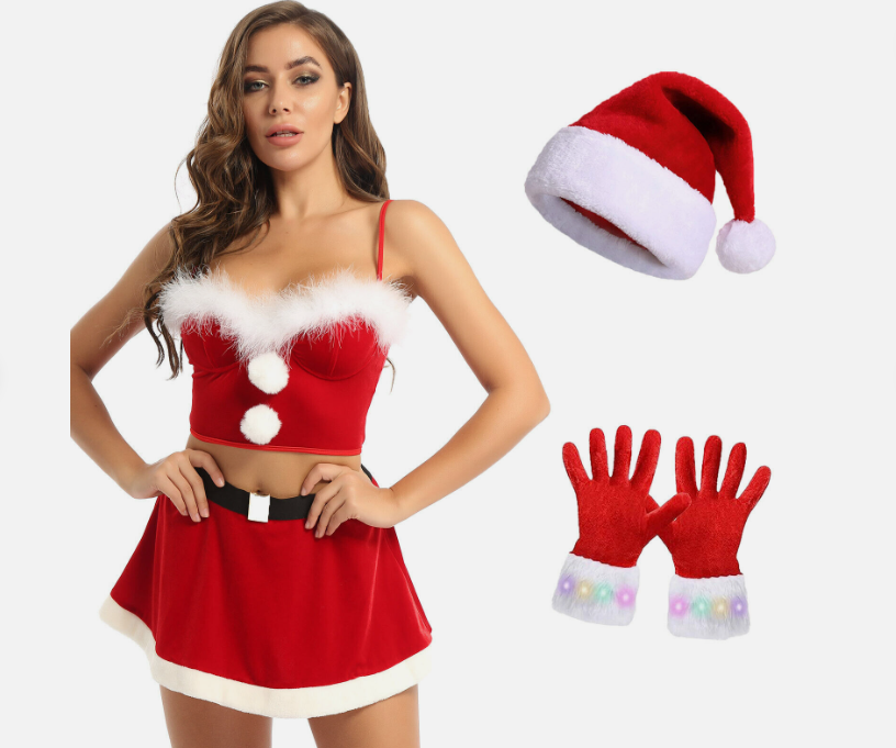 Woman's Crop Top with Skirts Christmas Costume Santa Hats and Gloves Fancy Dress