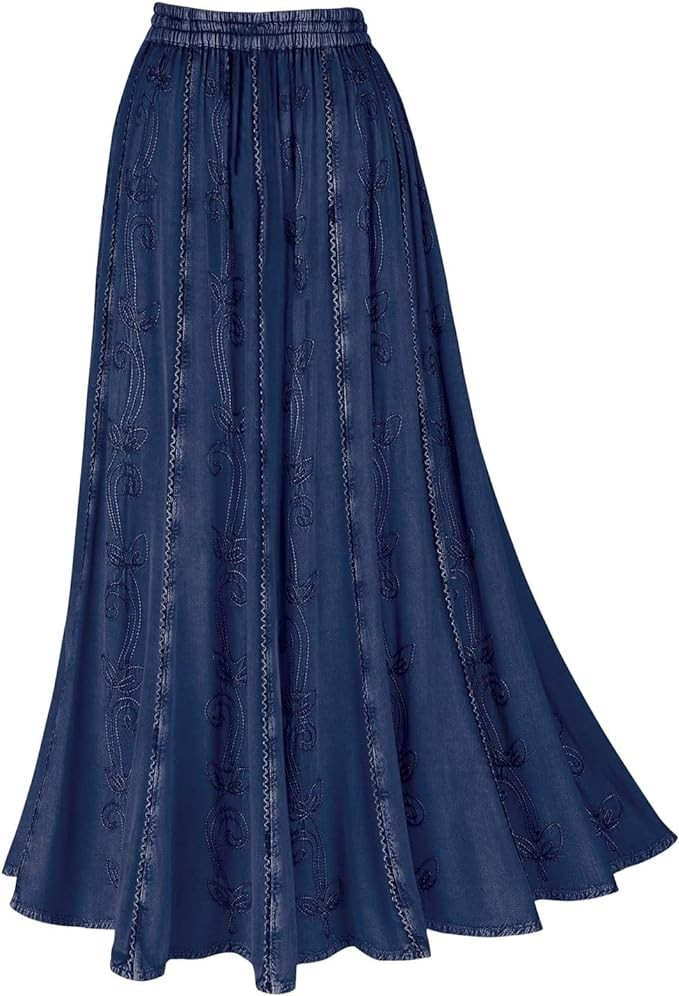 • EMBROIDERED FLORAL SKIRT IN RICH TONES - Swirled embroidery on the over-dyed, enzyme-washed women's skirts add texture to the soft rayon material. Choose Charcoal, Denim Blue, Eggplant, Olive, Rust, or Taupe.