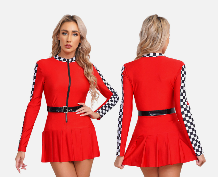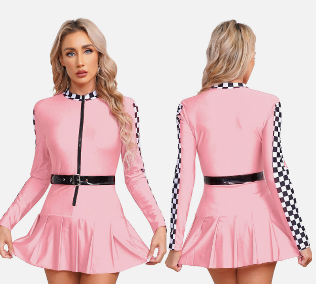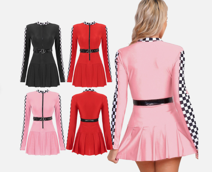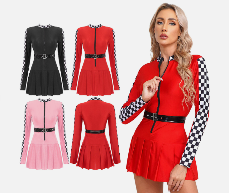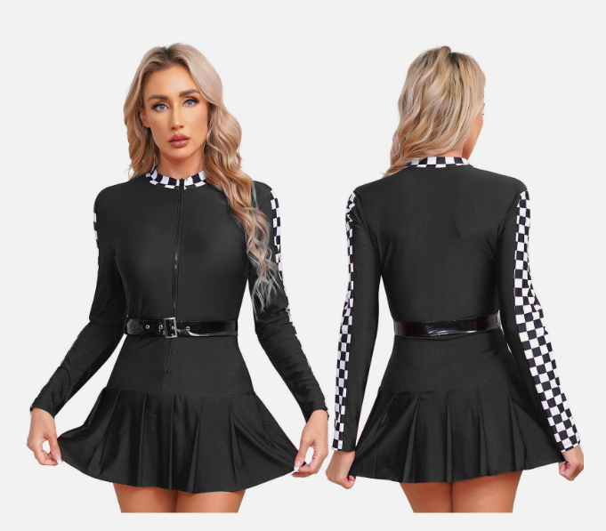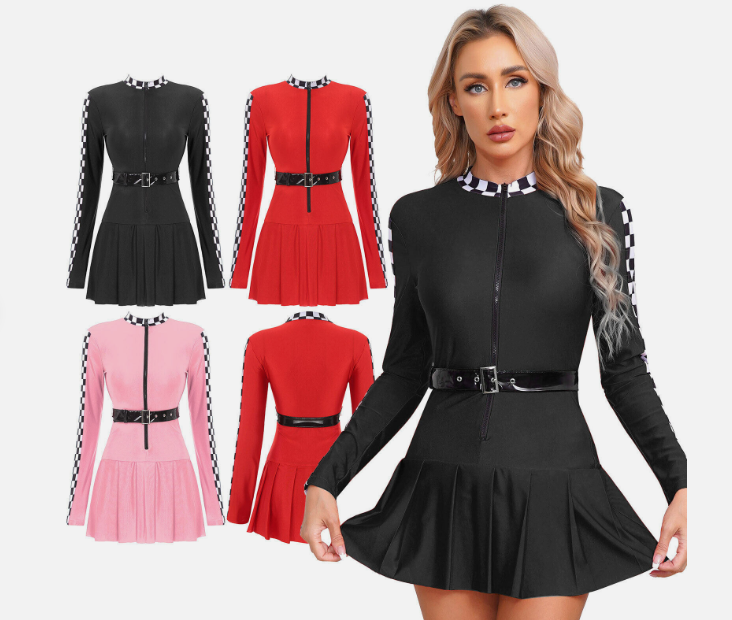 Womens Racer Dress Dance Pleated Skirt Front Zipper Checkerboard Cosplay Sexy